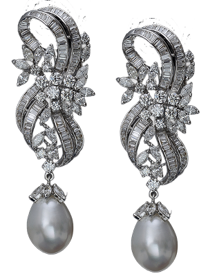 Cascading ribbons of baguette and round natural diamonds flowing into a lustrous pearl drop. A graceful masterpiece of fluid movement and classic glamour.