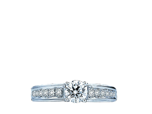 Timeless perfection featuring a striking round brilliant center, uplifted by a sleek band of channel-set natural diamonds. Pure, understated romance.