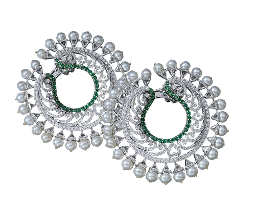 Majestic circular drops featuring intricate natural diamond lattice, accented by a vibrant emerald curve and edged with a halo of delicate pearls.