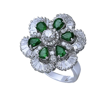 A vibrant floral bloom of pear-cut emeralds and natural diamonds, edged with a halo of glittering baguettes. A regal touch of color and light.