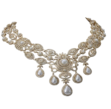 A dazzling natural diamond collar dripping with elegant pearl teardrops. Intricate latticework creates a silhouette of pure, cascading radiance.