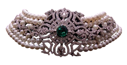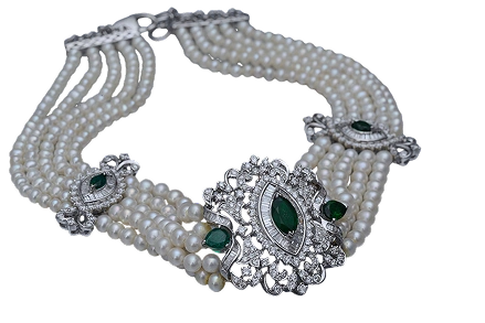 A majestic multi-strand pearl choker featuring a stunning natural diamond centerpiece, accented by matching side motifs. Royal elegance redefined.